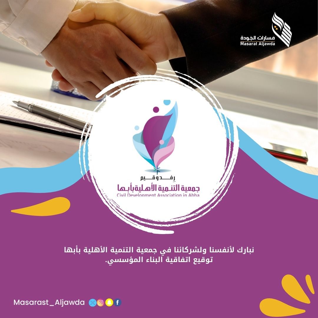 وقعت شركة مسارات الجودة الإدارية ممثلة بسعادة أ. فضة خواجي مدير عام الشركة اتفاقية التميز المؤسسي مع جمعية التنمية الأهلية بأبها و يمثلها المدير التنفيذي أ. مها بنت محمد الشهري , أبرمت الاتفاقية بتاريخ 20-1-2025م لمدة ثلاثة أشهر من تاريخ توقيع الاتفاقية.